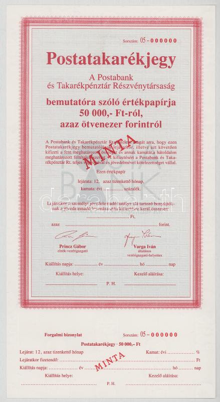1990 k. "Postatakarékjegy" 50.000Ft-ról, "MINTA" bélyegzéssel, "000"-á... https://www.darabanth.com/hu/518-Filatelia-kepeslap-numizmatika-mutargy-konyv-papirregiseg-ekszer-aukcio/524.0/Numizmatika/Reszvenyek-es-sorsjegyek~880/1990-k-Postatakarekjegy-50000Ft-rol-MINTA-belyegzessel-000-as-sorszammal-plus~II3519417