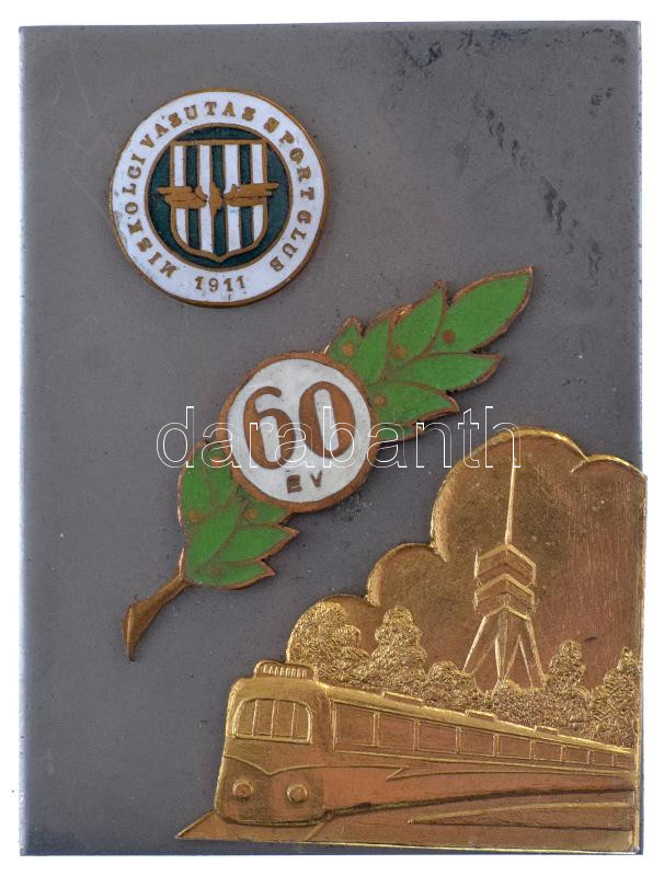 1971. "Miskolci Vasutas Sport Club (MVSC)" fém plakett zománcozott és aranyozott rátétekkel a klub alapításának 60. évfordulója alkalmából (59x80mm). A zöld-fehér színeket viselő Miskolci Vasutas SC-t 1911-ben alapították. A csapat a kezdetektől egészen 1937-ig folyamatosan II. osztályú volt. A kiesésig három bajnoki címet, három ezüstérmet és hat bronzérmet szerzett. Az 1937-es kiesést követően két szezon után visszajutott az addigra NB II-nek nevezett másodosztályba, s tagságát meg is tartotta egészen 1946-ig, majd egy III. osztályú idény után visszajutottak. 1948-ban a klubot Miskolci Lokomotívnak, majd 1955-ben egy idény erejéig Miskolci Törekvésnek hívták. 1956-tól ismét MVSC, ez idő alatt végig az NB II-ben szerepelt a klub. 1958-ban aztán az MVSC történelme során először összejött az, ami a városi rivális Diósgyőrnek már régen: az NB II-t megnyerve feljutottak az NB I-be. Ekkor játszottak először, s utoljára városi rangadót az élvonalban a DVTK ellen, szezon végén ugyanis kiestek, s nem is tértek már vissza soha. Lassú süllyedés következett a klub életében, 1969-ig a hol NB II-nek, hol NB I/B-nek nevezett másodosztály taghjai voltak, majd következett öt idény a III. osztályban a visszajutásig. Ekkor már csak négy szezont töltöttek a másodvonalban, mikor is zsinórban két kiesést követően 1983-ban a megye I-ben (IV. osztály) találták magukat. Innen még azonnal sikerült visszajutni, azonban ismét kiestek, s következett hatszezonnyi megye I-es szereplés. 1991-ben sikerült a visszajutás az NB III-ba, sőt, 1994-ben még az NB II is összejött, azonban újra megindultak lefelé: az ezredfordulóra újra a megye I-ben találták magukat, ami akkor már csak az V. osztályt jelentette. Utolsó bajnoki címüket 2004-ben szerezték a megye I-ben, ám az NB III. Tisza csoportjában eltöltött idő tiszavirág-életűnek bizonyult, a következő idényben visszatértek a megyei szintre, s két szezont eltöltöttek a megye II-ben is. T:AU,XF patina