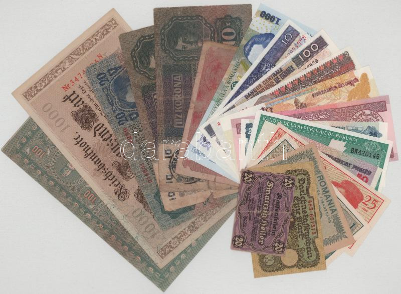Vegyes, 20db-os magyar és külföldi bankjegytétel, benne: Indonézia, Németország, Románia, Nicaragua, Afganisztán, Kambodzsa, Burundi T:UNC-G
