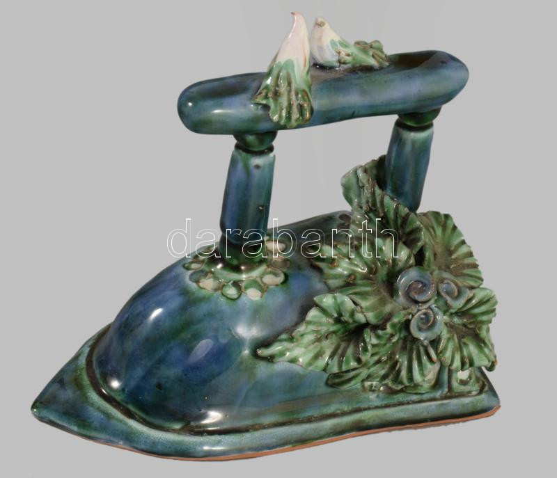 Leírás: Morvay Zsuzsa (1946-): Vasaló alakos asztaldísz, mázas kerámia jelzett, kis kopással,,14x16 cm