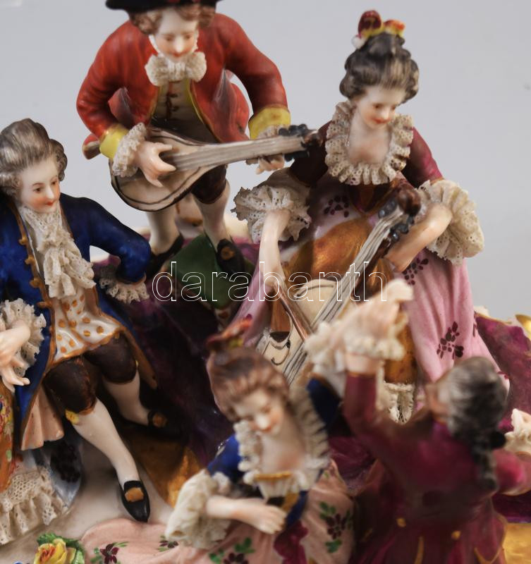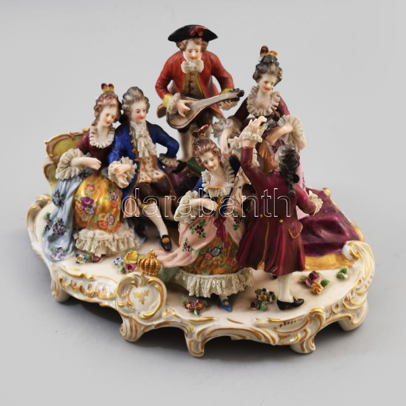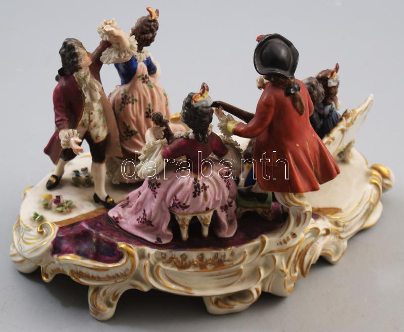 Leírás: 1915-1934 Aelteste Volkstedter Porzellanfabrik Báli életkép. Hatalakos rokokó stílusú porcelán szoborcsoport, jelzett, kézzel festett, szobrokon 1-1 sérüléssel, 23x16x15cm