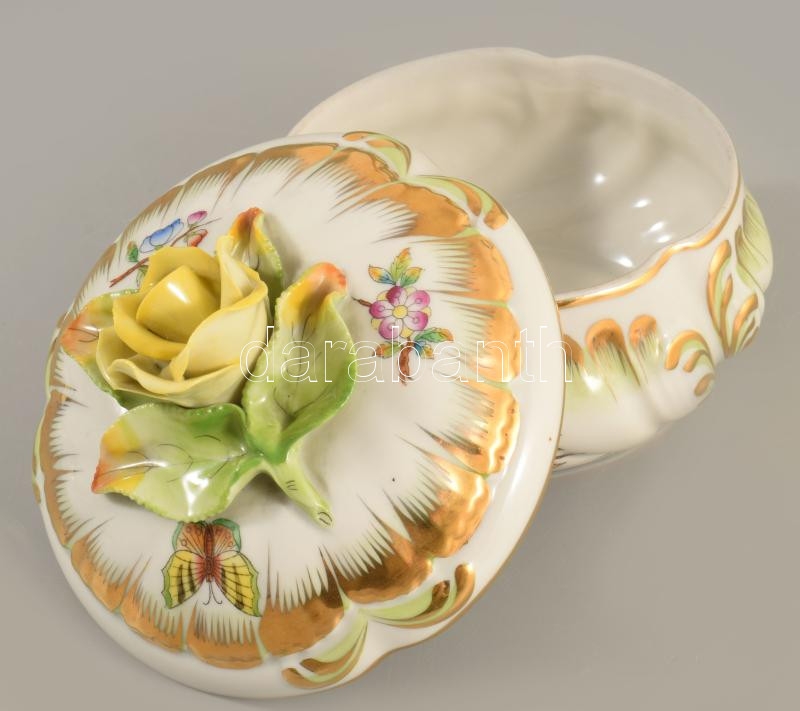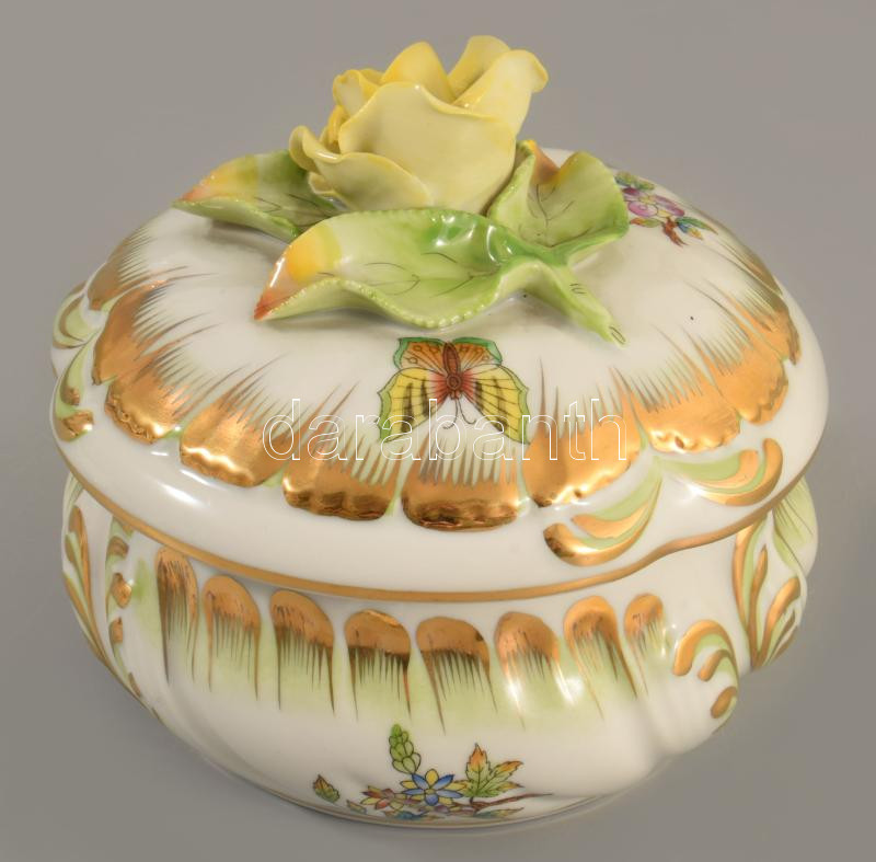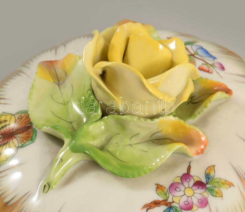Leírás: Herendi Viktória mintás bonbonier, plasztikus sárga rózsa fogóval, jelzett, hibátlan, d: 12 cm, m: 11 cm