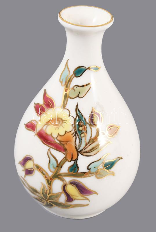 Leírás: Zsolnay aranykontúrozott virágmintás kisváza. Jelzett, hibátlan, m: 11,5 cm