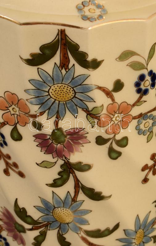 Leírás: cca 1885 Zsolnay aranykontúrozott virágmintás kanna. Jelzett, csőre letört, m: 19 cm