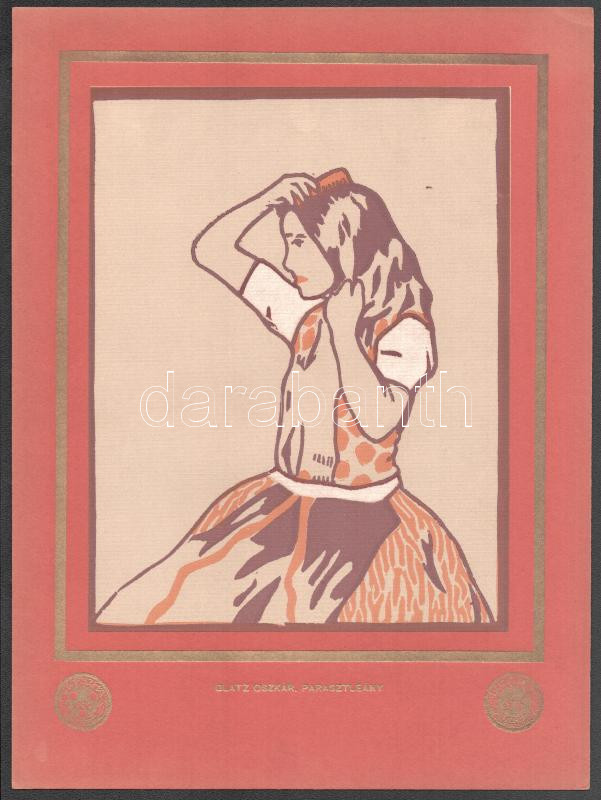 Glatz Oszkár (1872-1958): Parasztleány. Színes linómetszet, papír. Megjelent 1911-ben, a Modern Magyar Magyar Képtár c. mappában, 23x18 cm.