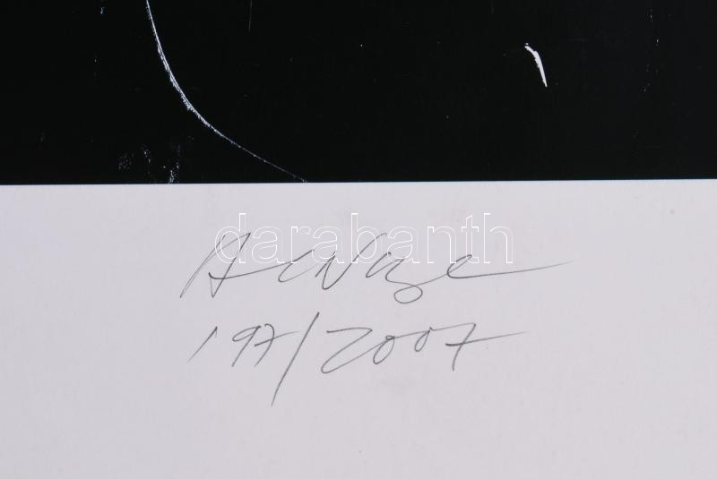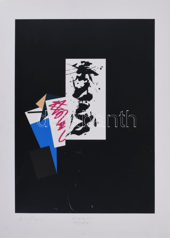 Hencze Tamás (1938-2018): Geometria és gesztus, '97/2007. Szitanyomat, papír, jelzett. Hencze Tamás autográf ajánlásával. Törésnyomokkal. Lapszéli kisebb ázásnyomokkal és apró szakadással. 48,5x35 cm