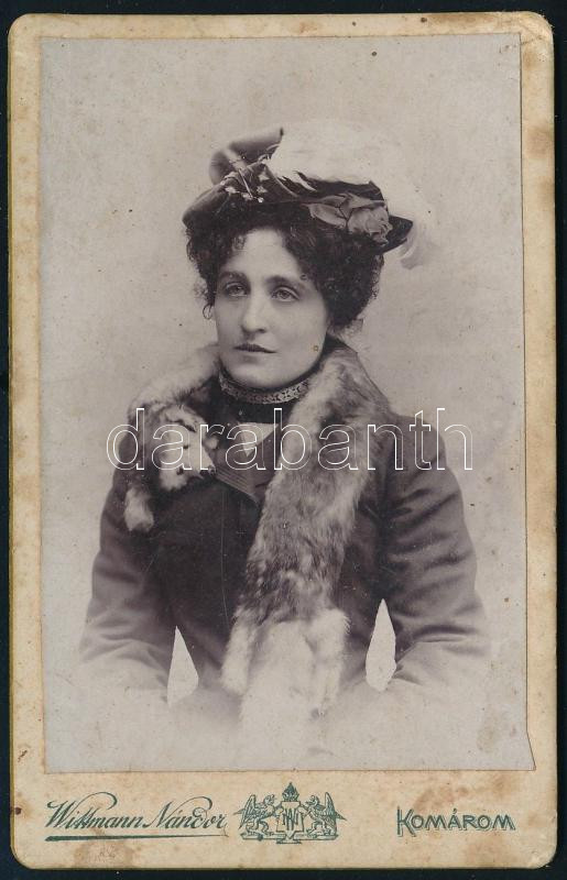 cca 1900 Elegáns hölgy nerc sállal, vizitkártya Wittmann Nándor komáromi (Komárno) műterméből, foltos, 10,5x6,5 cm