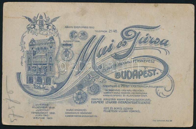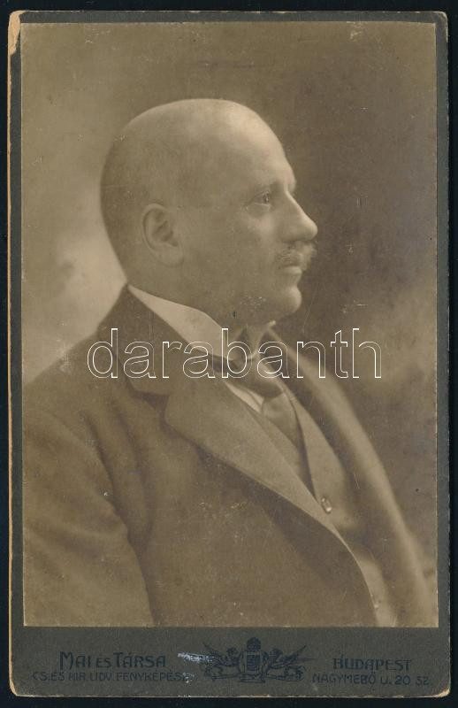 cca 1902 Férfiportré, kekményhátú fotó Mai és Társa budapesti műterméből, hátoldalon a műterem képével, 16,5×10,5 cm