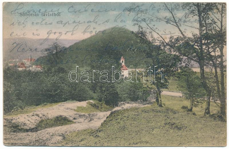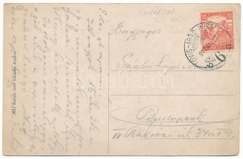 1917 Soborsin, Szoborsin, Savarsin; látkép távlatból. Kerpel Izsó kiadása / general view + "TÖVIS - ARAD - BUDAPEST 6 D" vasúti mozgóposta bélyegző (EK)