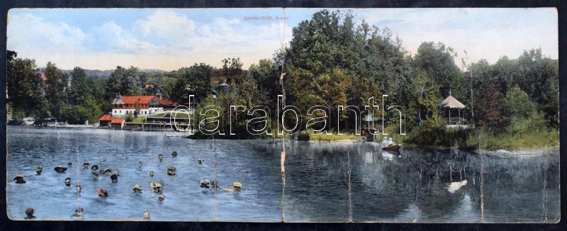 1918 Szovátafürdő, Baile Sovata; Medve-tó, fürdőzők. 2-részes kinyitható panorámalap. Zsula Sándor kiadása / lake, bathers. 2-tiled folding panoramacard (szakadások / tears)