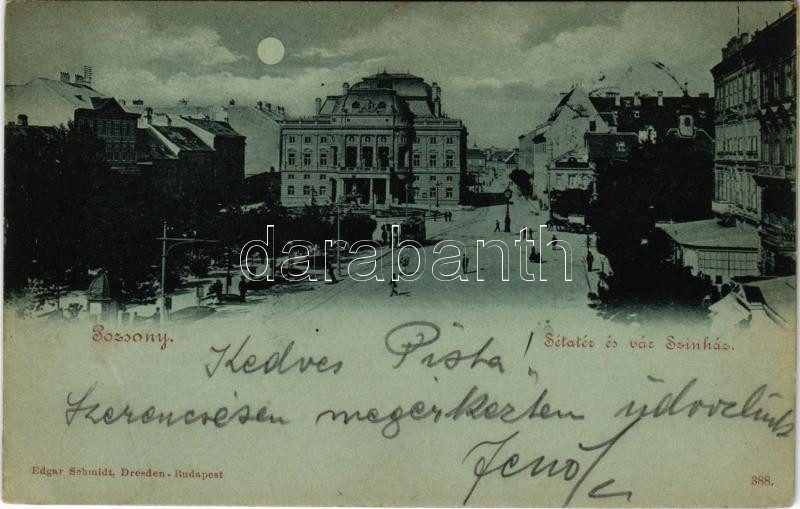 1901 Pozsony, Pressburg, Bratislava; Sétatér és városi színház este holdfényben, villamos. Edgar Schmidt / promenade and theatre at night in moonlight, tram