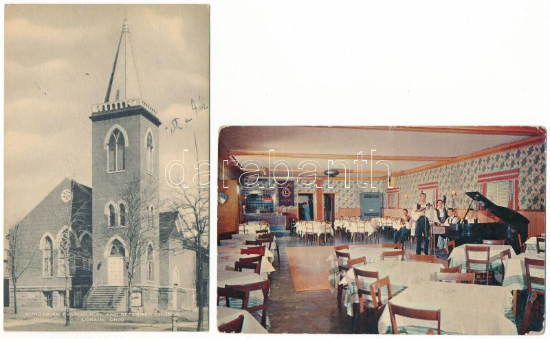 2 db RÉGI hungarika képeslap: magyar evangélikus templom Lorainban, magyar étterem Carteretben / 2 pre-1945 Hungarica postcards