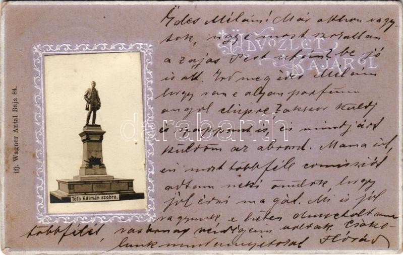 1903 Baja, Tóth Kálmán szobor, ragasztott fotó, dombornyomott képeslap. Ifj. Wagner Antal kiadása (fl)