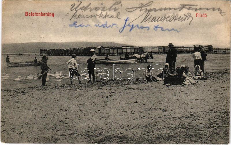 1920 Balatonberény, Balaton-Berény; Fürdő, fürdőzők, kabinok, lovaskocsi a vízben. Mérei Ignác kiadása