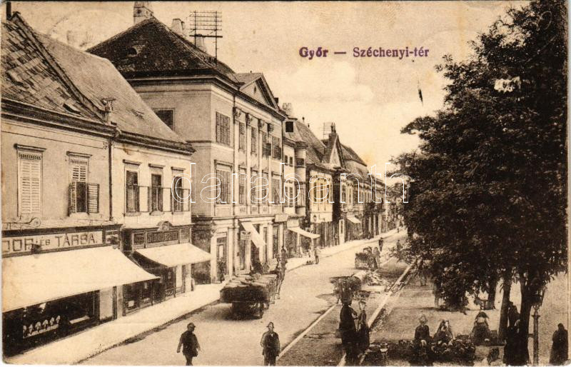 1922 Győr, Széchenyi tér, piac, lovaskocsi, Simon Ferenc üzlete, dohányáruda. Vasúti levelezőlapárusítás 481. (fl)