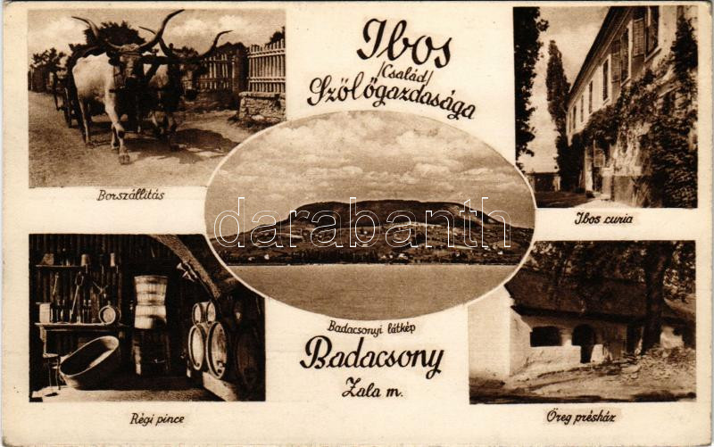 Badacsony, Ibos család szőlőgazdasága, borszállítás ökrös szekéren, Ibos kúria, régi pince, öreg présház, látkép. reklám (EK)