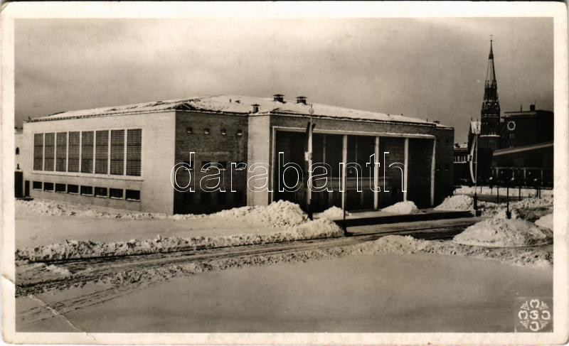 Budapest XIV. Horthy Miklós Nemzeti Sportcsarnok kiscsarnoka 1942. január végén, télen, háttérben a Rózsafüzér Királynéja templom (EB)