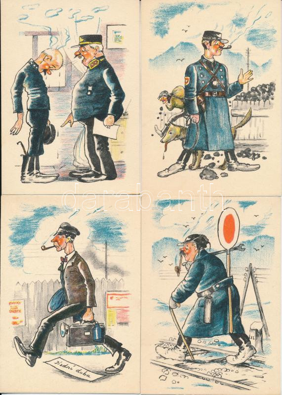 9 db MODERN megíratlan cseh grafikai képeslap: vasutas humor / 9 modern unused Czech graphic art postcards: train, locomotive s: F. Dus