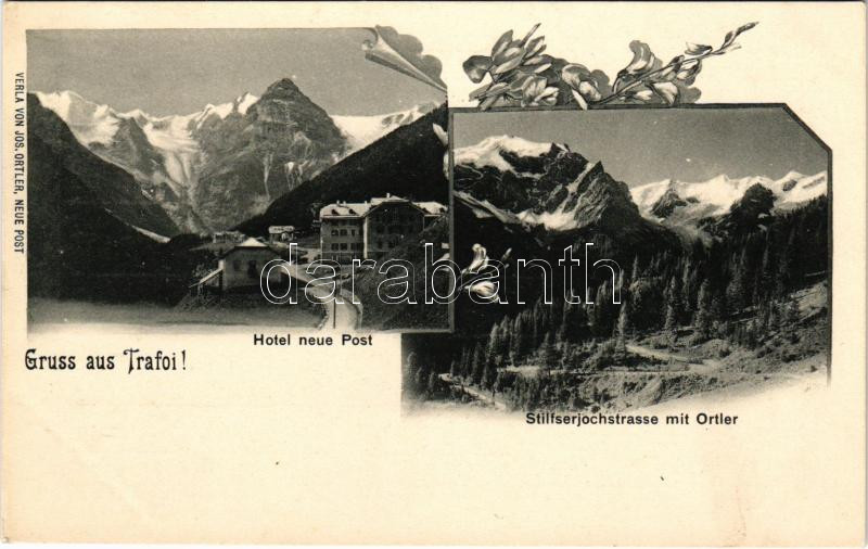Trafoi (Stelvio, Stilfs; Südtirol); Hotel neue Post, Stilfserjochstrasse mit Ortler. Jos. Ortler Art nouveau floral