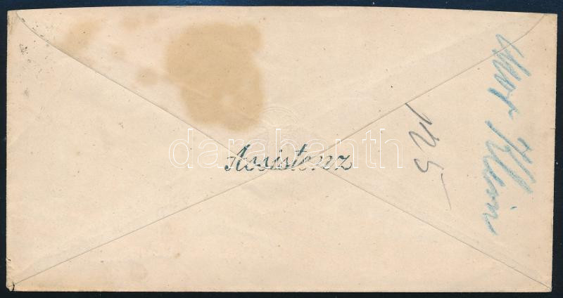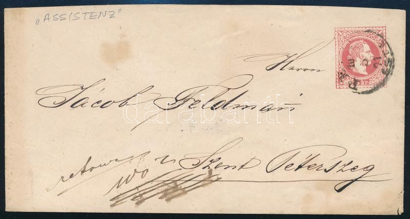 1867 5kr díjjegyes boríték "PEST / ESTE" - Szent Péterszeg + a hátoldalon kék "Assistenz" (címkereső) bélyegzéssel (nagy bélyegzés ritkaság).