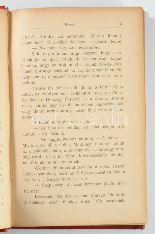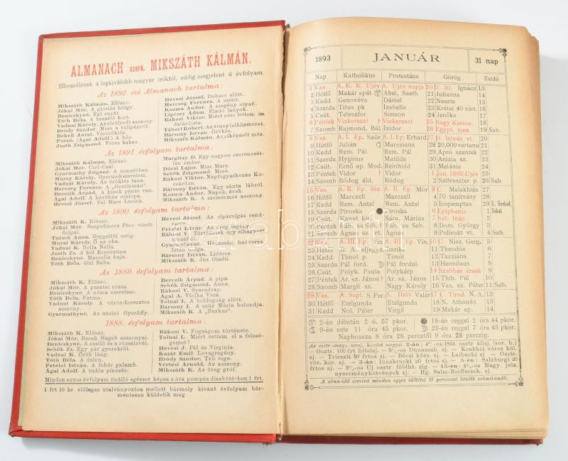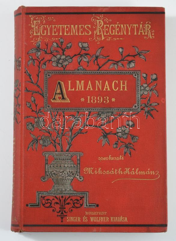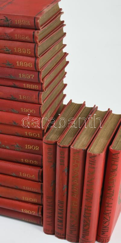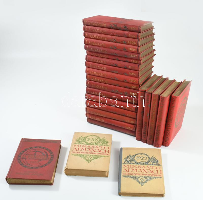 Egyetemes Regénytár Almanach 1893-1910. Szerk.: Mikszáth Kálmán. Mikszáth Almanach 1912, 1914, 1915 (x2), 1918, 1922. Bp., 1893-1922, Singer és Wolfner. Kiadói aranyozott, festett egészvászon-kötések, valamint kiadói kartonált papírkötés, és kiadói félvászon-kötés, változó állapotban, közte kopott borítókkal is, két duplummal (1900, 1915), egy kötetből néhány kijáró lappal.