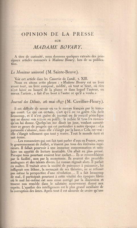 Gustave Flaubert (1821-1880) klasszikus regénye először folyóirat-folytatásokban, majd egy évvel később, 1857-ben kötet alakban is megjelent. Az 1857-es év két nevezetes irodalmi pert is hozott Franciaországban, Charles Baudelaire költőt "Les Fleurs du mal" (A Romlás virágai) című verseskötetéért, Gustave Flaubert írót Madame Bovary (Bovaryné. Vidéki erkölcsök) című regényéért fogták perbe, a művek erkölcsromboló hatására való hivatkozással. (Gustave Flaubert jó kapcsolatainak köszönhetően elkerülte a börtönbüntetést). A modern házasság problémáit körbejáró regény nem is annyira témája miatt, mint szenvtelensége, morális állásfoglalás nélküli mivolta miatt vívta ki a hatóságok haragját.