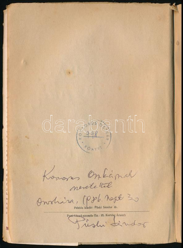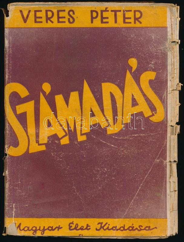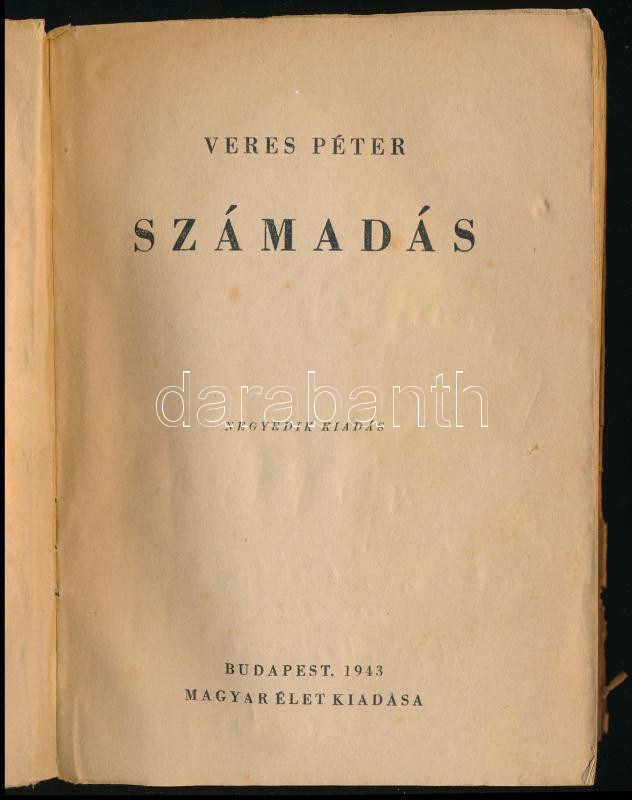 Veres Péter: Számadás. Püski Sándor (1911-2009) könyvkiadó, a Magyar Élet alapítója által Koszorús Oszkár (1942-2025) okleveles könyvtáros, Orosháza város helytörténésze részére dedikált példány! Bp., 1943, Magyar Élet, 397+[3] p. Kiadói papírkötés, kissé viseltes állapotban, helyenként kissé foltos lapokkal, sérült kiadói papír védőborítóban. Koszorús Oszkár tulajdonosi bélyegzőjével.