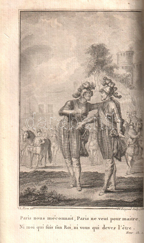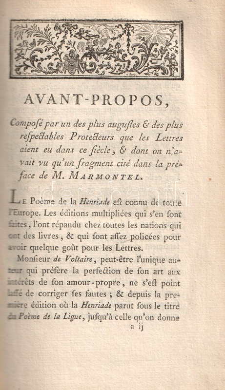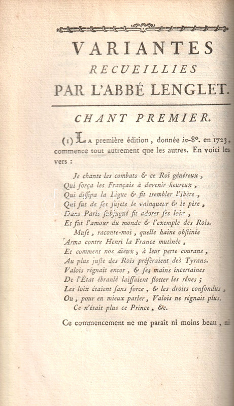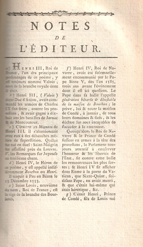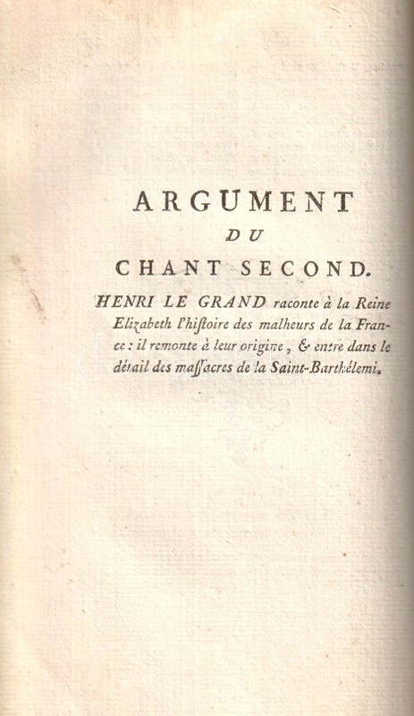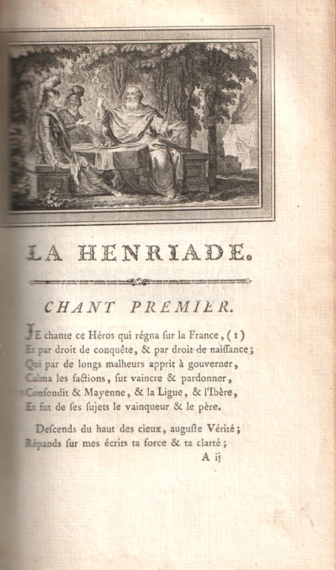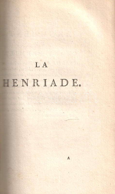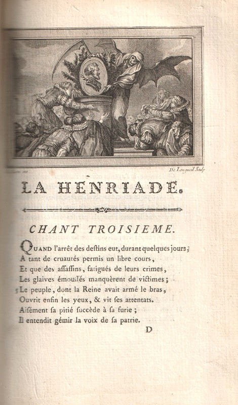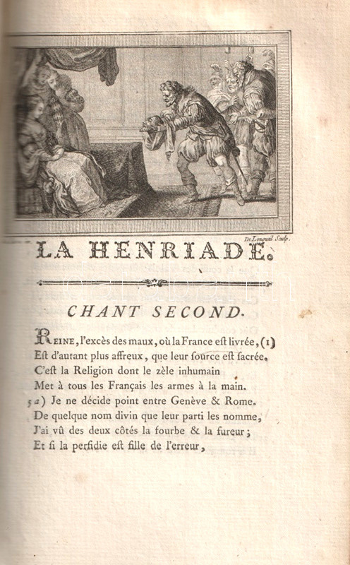 Voltaire (1694-1778) klasszikus eposza, a IV. Henrik vallási toleranciáját dicsőítő La Henriade, bár nem tartozik Voltaire fő művei közé, Franciaországban mégis közismertnek számít, egykor kötelező olvasmány is volt. A klasszikus versmértékben írt eposz első kiadása 1723-ban jelent meg Genfben. Példányunk a mű előszavait, illetve eredeti kiadásának teljes, tíz ének terjedelmű szövegét közli, szövegváltozatokkal és szövegmagyarázatokkal, oldalszámozáson belül további tíz szövegközti illusztrációval. A második kötet, mely példányunknak nem része, a hőseposz új, átigazított szövegét közli.