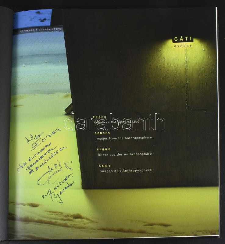 Gáti György: Érzék. Képek az Antroposzférából. Senses. Sinne. Sens. Hommage á Lucien Hervé. A művész, Gáti György (1954-) fotóművész által DEDIKÁLT példány. [2010], Magánkiadás, 112+8 p. Gazdag fotóanyaggal illusztrált. Kiadói kartonált papírkötés, kiadói papír védőborítóban, kartontokban, szép állapotban.