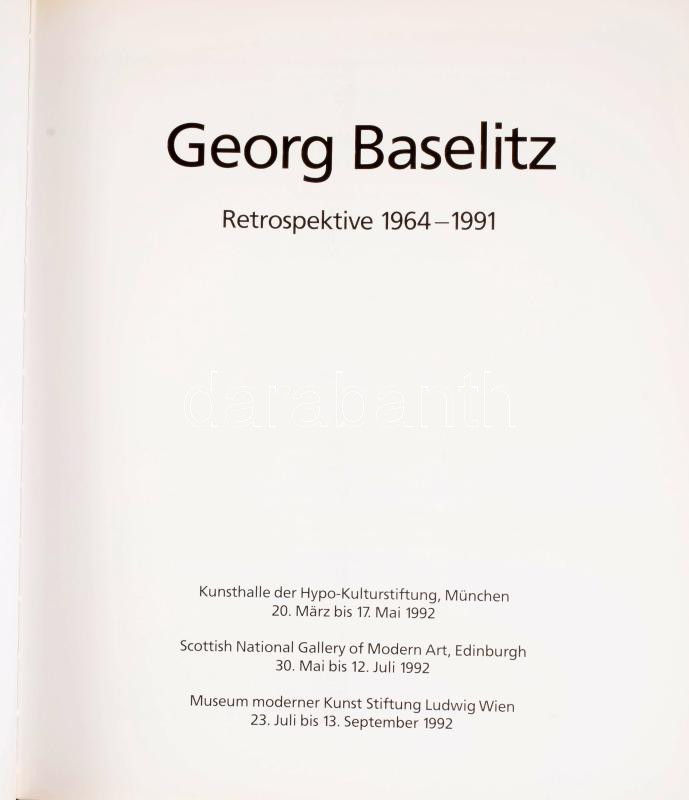 Georg Baselitz: Retrospektiv 1964-1991. München, 1992., Kunsthalle der Hypo-Kulturstiftung, 263 p. Német nyelven. Gazdag képanyaggal illusztrált. Kiadói kartonált papírkötés.