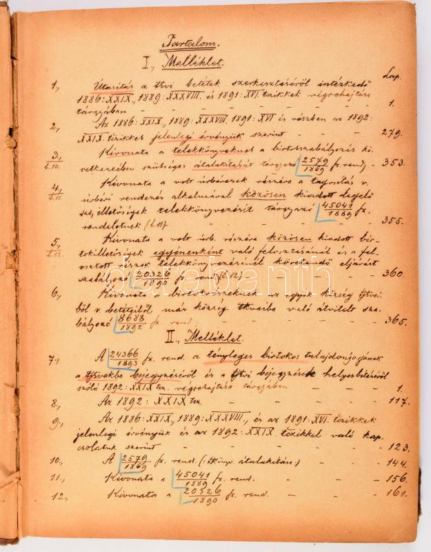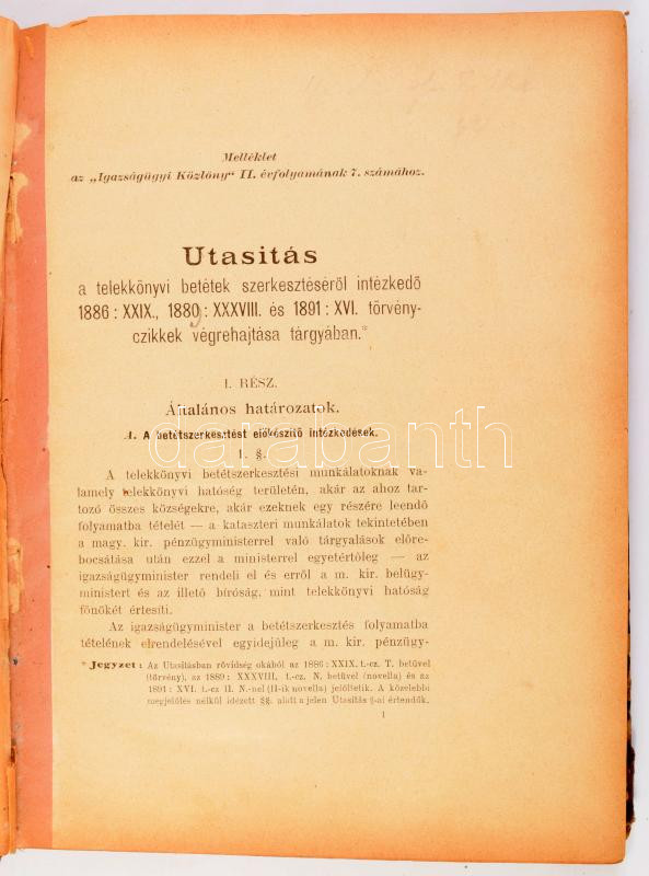 Utasítás a telekkönyvi betétek szerekesztéséről intézkedő 1886: XXIX, 1880: XXXVIII. és 1891: XVI. törvény-czikkek végrehajtása tárgyában. Melléklet az "Igazságügyi Közlöny" II. évf. 7. számához. + A kir. igazságügyminsternek 24.366/1893. I. M. számú rendelete, 376+165 p. A Zemplén-vármegyei szentkirályszabadjai Karsa Ferenc (1827-1915) 1848-as honvéd hadnagy, Görgey Artúr parancsőrtisztje, árvaszéki elnök jegyzeteivel. Félvászon-kötésben, egy sérült, javított lappal.