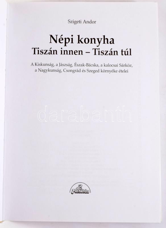 Szigeti Andor: Népi konyha. Tiszán innen - Tiszán túl. A Kiskunság, a Jászság, Észak-Bácska, a kalocsai Sárköz, a Nagykunság, Csongrád é Szeged környéke ételei. Jelenlévő múlt. Bp., 2001, Planétás Kiadó, 346+[2] p. Kiadói kartonált papírkötés.