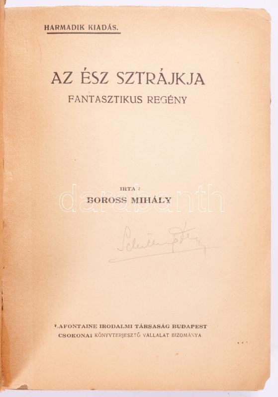 Boross Mihály: Az ész sztrájkja. Fantasztikus regény. A címlap Scheiber Hugó alkotása. Bp., Lafontaine. Kiadói papírkötés, gerinc sérült, kopottas állapotban.