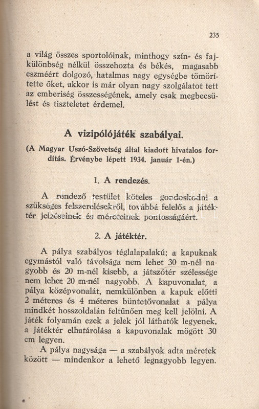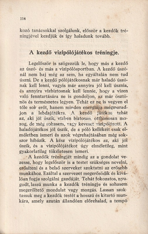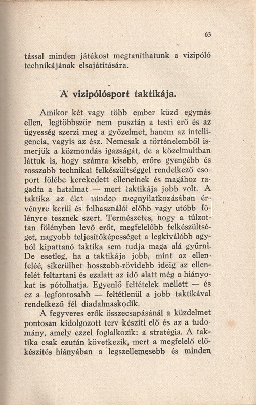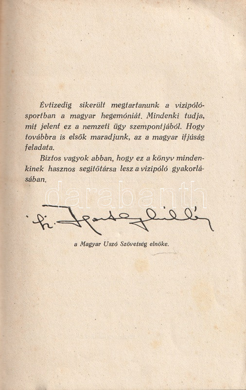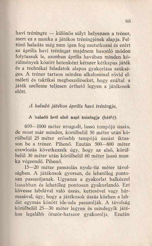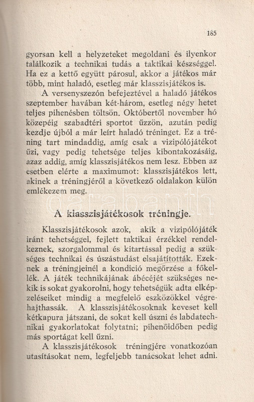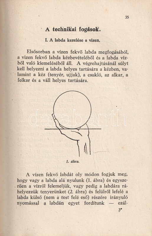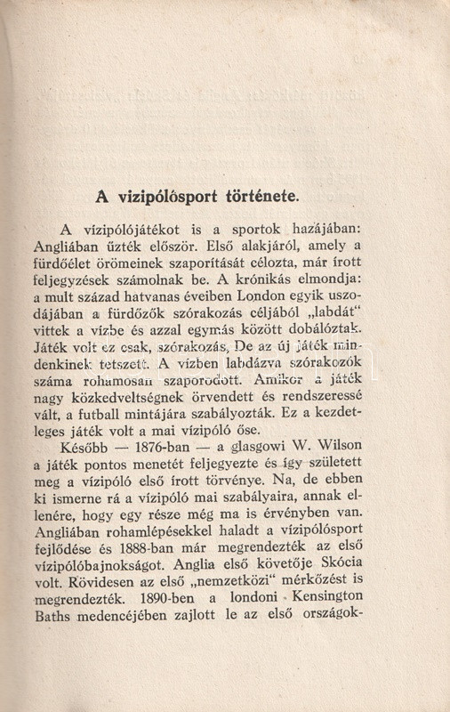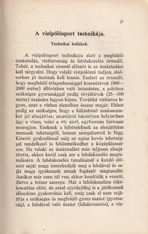 Homonnai Márton (1906-1969) olimpiai bajnok és többszörös Európa-bajnok vízilabdázó, edző, szövetségi kapitány kötete a vízilabdasport gazdagon illusztrált szakmonográfiája. A történeti áttekintés után a vízilabdasport technikai és taktikai részleteibe avat be, majd az edzéshez ajánl különböző programokat. A bíráskodás fortélyai, illetve a szakosztályi, szervezeti élet részletei a munka végén.