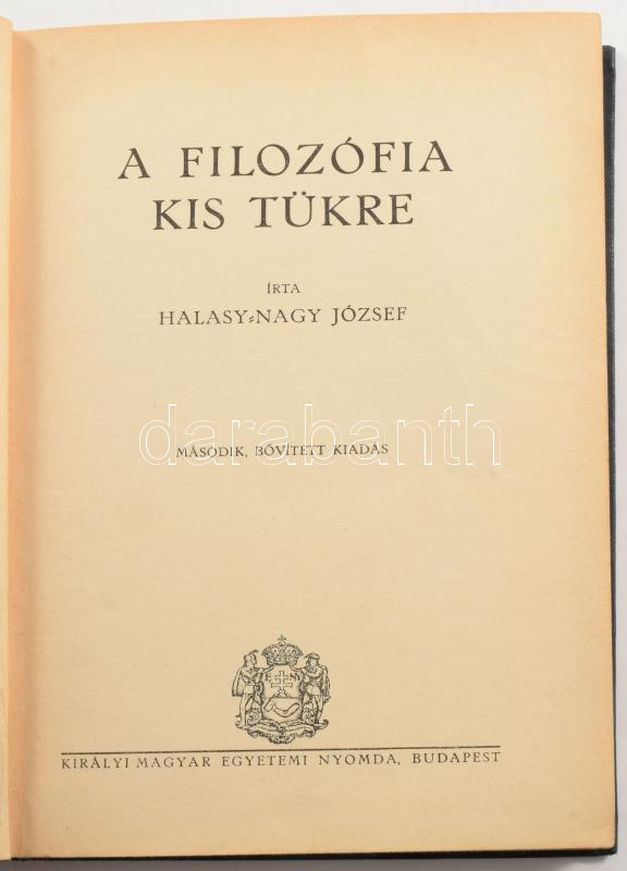 Halasy-Nagy József: A filozófia kis tükre. Bp.,(1937), Kir. M. Egyetemi Nyomda. Második, bővített kiadás. Kiadói aranyozott egészvászon-kötés.