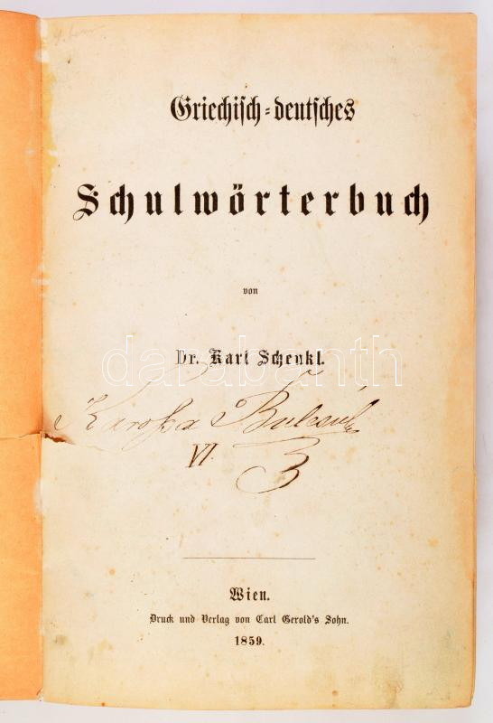 Schenkl, Karl: Deutsch-Griechisches Schulwörterbuch von Dr. Wien, 1859, Karl Gerold's Sohn, IX+1+910 p. Német és görög nyelven. Átkötött félvászon-kötés, a könyvtest elvált a borítótól, az utolsó lap elvált a gerinctől, a szennylapok foltosak.