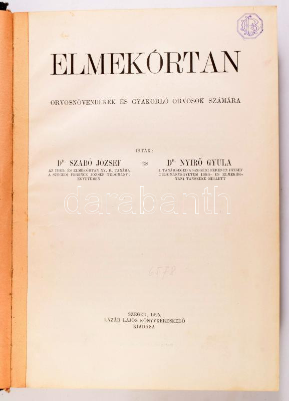 Szabó József - Nyírő Gyula: Elmekórtan. Orvosnövendékek és gyakorló orvosok számára. Szeged, 1925, Lázár Lajos, IV+596 p. Első kiadás. Félvászon-kötésben, kissé kopottas borítóval.