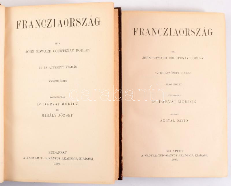 Bodley, John Edward Courtenay: Francziaország. I-II. köt. Ford. Darvai Móricz. Átnézte Angyal Dávid. Bp.,1899-1900., MTA, XXXI+360 p.; VIII+574 p. Kiadói aranyozott gerincű egészvászon-kötés, Müller-kötés, kissé kopott borítóval.