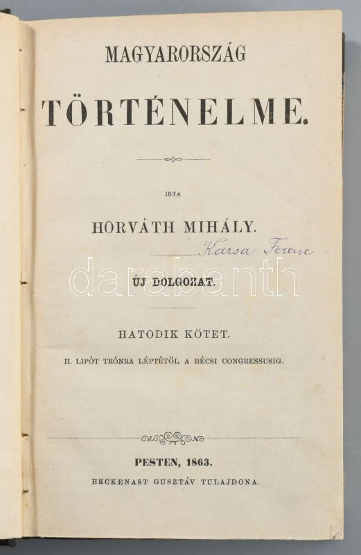 Horváth Mihály: Magyarország történelme 1-6. kötet. Ujonnan átdolgozta Dr. Hatvani Mihály. Pest, 1860-1863, Heckenast Gusztáv, IV+501+3 p.; 2+736 p.; 4+725+3 p.;2+543+1 p.; 2+455+1 p.; 4+422+1 p. Második kiadás (1-2 kötet). Új dolgozat (3-6. kötet).