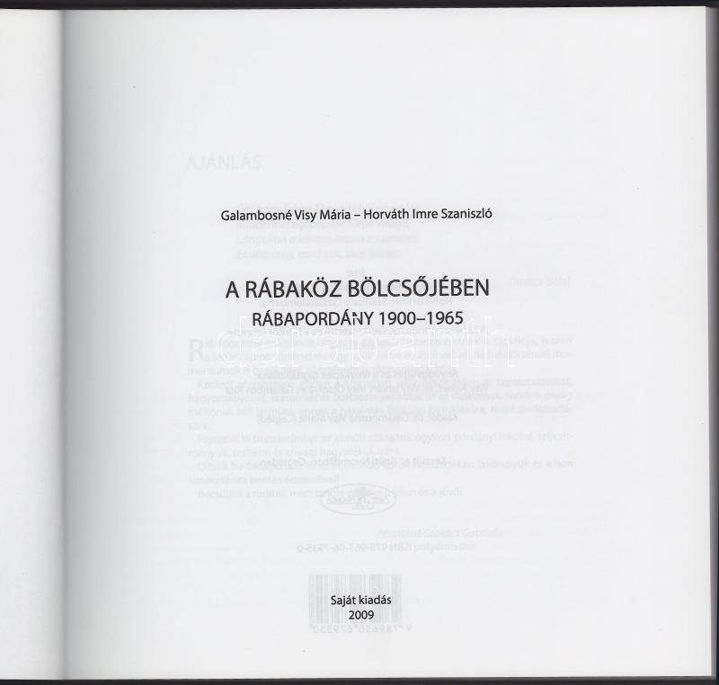 Galambosné Visy Mária - Horváth Imre Szaniszló: Rábapordány 1900-1965. A Rábaköz bölcsőjében. [Cegléd], 2009, szerzői kiadás, 172 p.+ 46 t. Kiadói papírkötés.