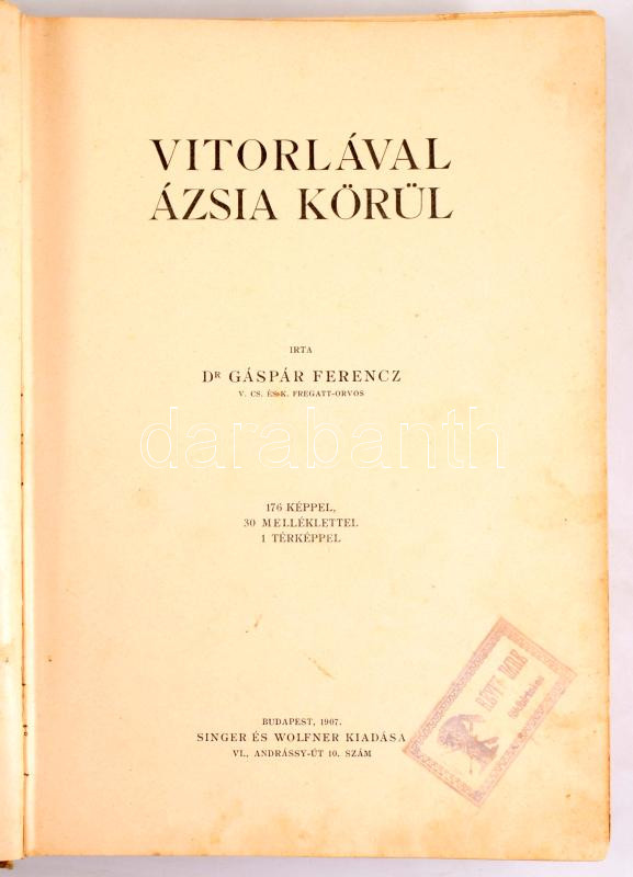 Gáspár Ferenc: Vitorlával Ázsia körül. A Föld körül IV. köt. Bp., 1907, Singer és Wolfner, 479+[1] p.+ 16 (eredetileg 31) t. Szövegközti és egészoldalas, fekete-fehér képekkel illusztrálva. Kiadói dombornyomott, illusztrált egészvászon-kötés, viseltes borítóval, helyenként foltos lapokkal, néhány szakadt lappal, hiányzó táblákkal, tulajdonosi bélyegzővel.
