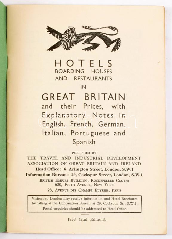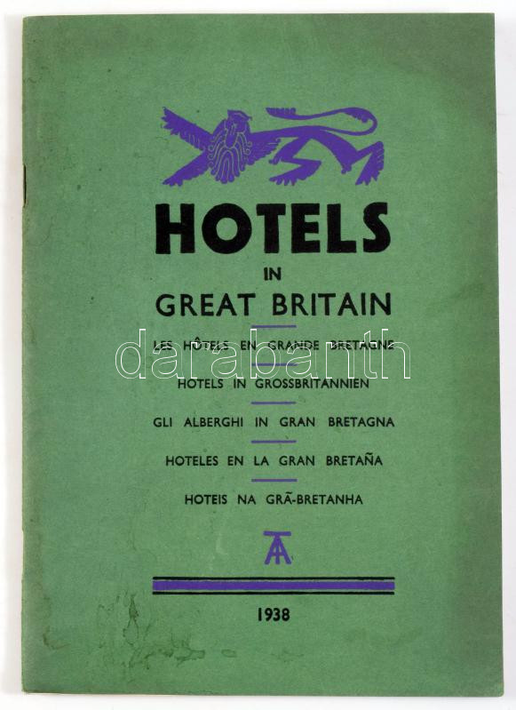 Hotels in Great Britain and their Preices, with Explanatory Notes in English, French, German, Italian, Portuguese and Spanish. London, 1938, The Travel and Industrial Development Association of Great Britain and Ireland, 64 p. Kiadói papírkötés.