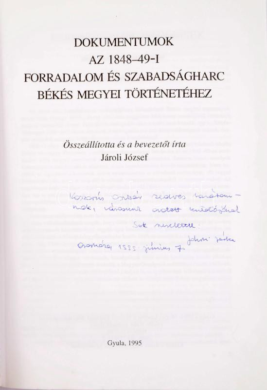 Jároli József: Dokumentumok az 1848-49-i forradalom és szabadságharc Békés megyei történetéhez. Összeáll. és a bevezetőt írta: - - . A szerző, Jároli József (1947-) helytörténész, nyug. főlevéltáros által dedikált példány! Gyula, 1995, Békés Megyei Levéltár, 511+[3] p. Kiadói papírkötés. + Jároli József: Békés a reformkorban és 1848-49-ben. Békés, 2006, magánkiadás, 128 p. Kiadói papírkötés.