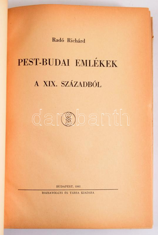 Radó Richárd: Pest-budai emlékek a XIX. századból. Bp., 1941, Rózsavölgyi és Társa. Kiadói restaurált papírborító, félvászon kötés, kissé kopottas állapotban.