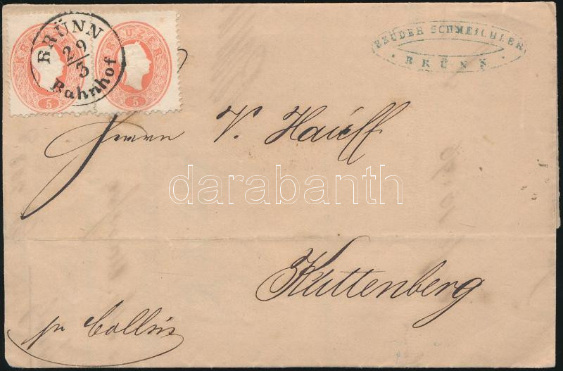 1862 2 x 5kr levélen "BRÜNN Bahnhof" - "KUTTENBERG"