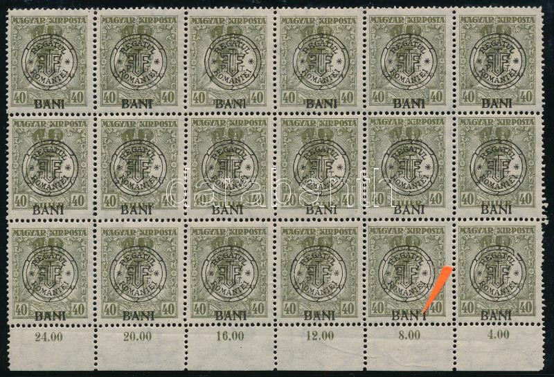 Kolozsvár 1919 Zita 40f ívszéli 18-as tömbben, az alsó sor jobbról a második bélyegen "BAN I" tévnyomat, Bodor vizsgálójellel