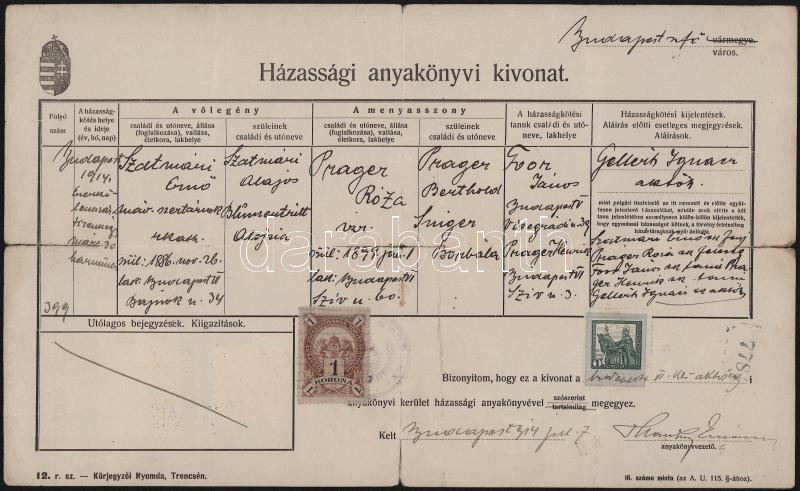 1914 Budapest Városi és állami illetékbélyeg okmányon