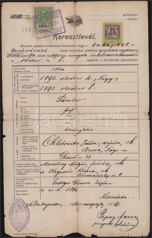1926 Budapest Városi és állami illetékbélyeg okmányon