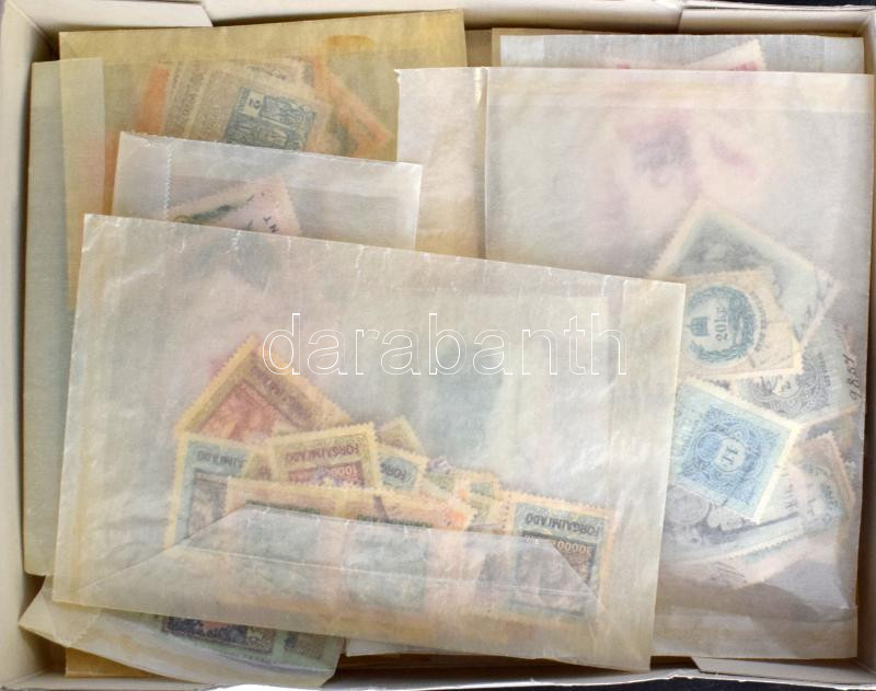 Sok 100 db okmánybélyeg tasakokban, közte korai Forgalmi adóbélyeg, használt és használatlanok, összefüggések, dobozban