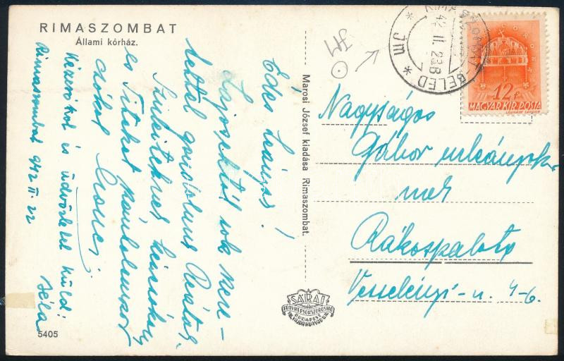 1942 Képeslap "RIMASZOMBAT-BELED" jegyzékelőmenet bélyegzéssel
